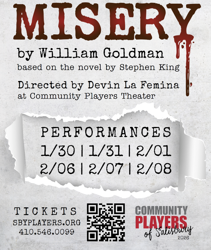 Salisbury, MD - The Community Players of Salisbury have announced their upcoming production of Misery. This psychological thriller is written by William Goldman and is based on the bestselling novel by Stephen King. The show is scheduled to run from January 30 through February 8 in Salisbury, Maryland.