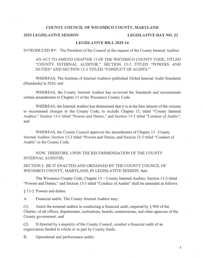 The County Council recently issued a press release stating that Bill 2025-14 was passed specifically to allow the Council itself to be audited. Under current county law, the Internal Auditor is prohibited from auditing an agency by which they were employed in the preceding two years.