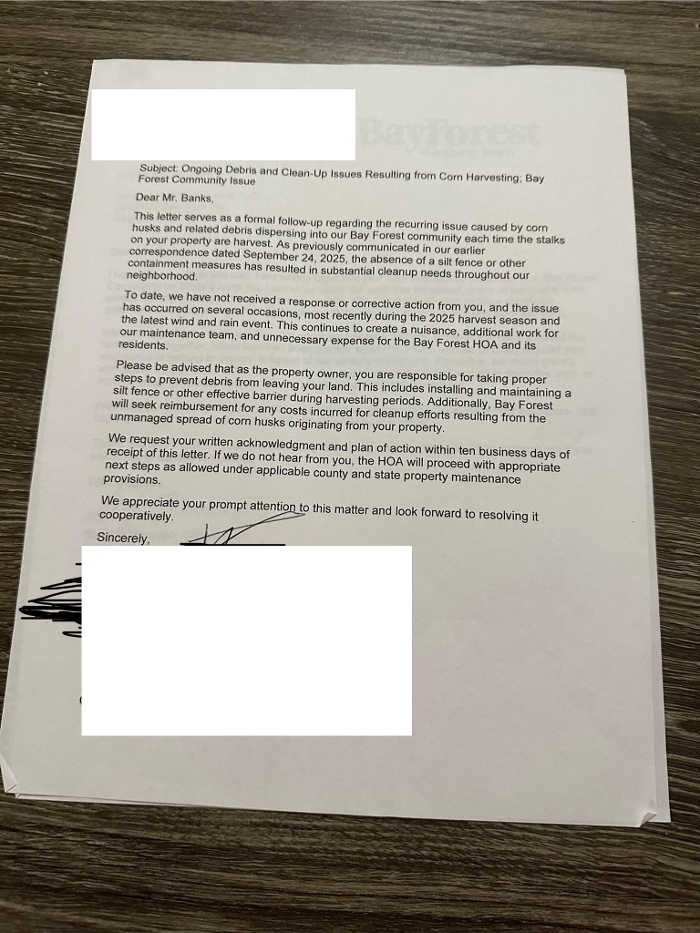 A representative for Bay Forest issued a warning regarding potential liability and costs. The correspondence stated: "Please be advised that as the property owner, you are responsible for taking proper steps to prevent debris from leaving your land. This includes installing and maintaining a silt fence or other effective barrier during harvesting periods. Additionally, Bay Forest will seek reimbursement for any costs incurred for cleanup efforts resulting from the unmanaged spread of corn husks originating from your property. We request your written acknowledgment and plan of action within ten business days of receipt of this letter. If we do not hear from you, the HOA will proceed with appropriate next steps as allowed under applicable county and state property maintenance provisions."