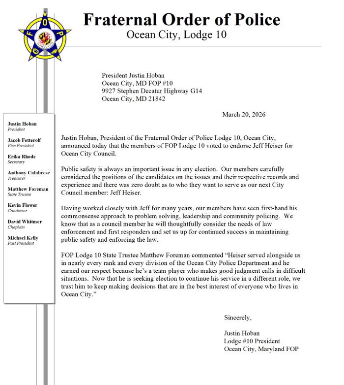 Ocean City, MD - Members of the Fraternal Order of Police - Ocean City Lodge 10 voted to officially endorse Jeff Heiser for Town of Ocean City Council.
