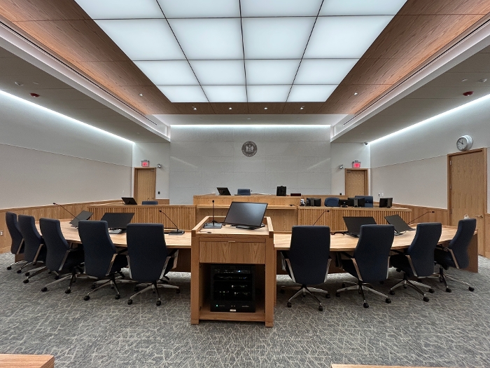 Security and operational spaces have also been expanded. There are more holding cells to ensure proper separation of individuals in custody from judicial officers and staff. The facility provides increased space for court staff and dedicated areas for justice system partners, including the Department of Justice, the Office of Defense Services, and the Office of the Child Advocate.