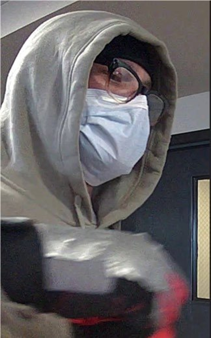 The suspect is described as a white male in his late 50s to early 60s, approximately 5'11" tall with an average build. At the time of the robbery, he was wearing a hooded sweatshirt, jeans, gloves, glasses, and a medical-style mask.